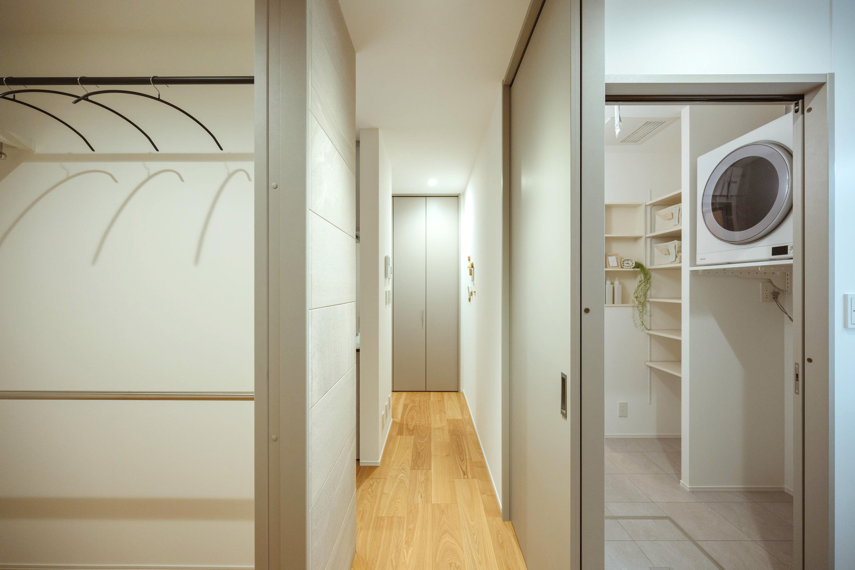 ファミリークローゼットが生活空間と水まわりを緩やかにつなぎ、回遊できる動線を実現。収納と洗濯スペースが近く、家事が1階で完結する間取り。