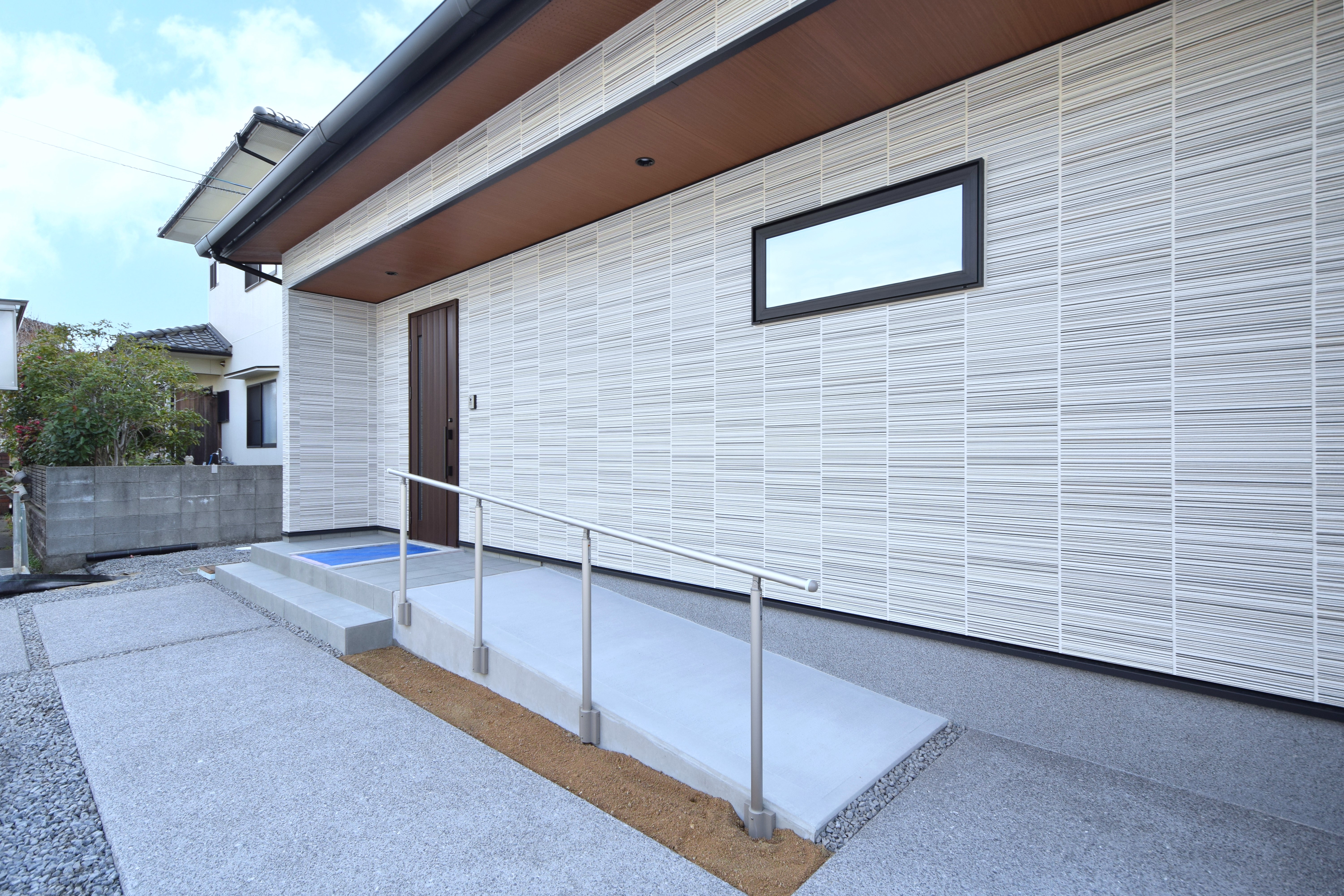 こちらの平屋は将来の事も考えて、車椅子でも玄関にあがれるスロープを設置。