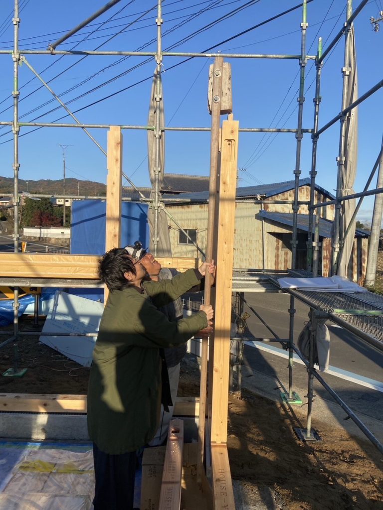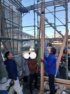 お施主さまと柱を立てています!