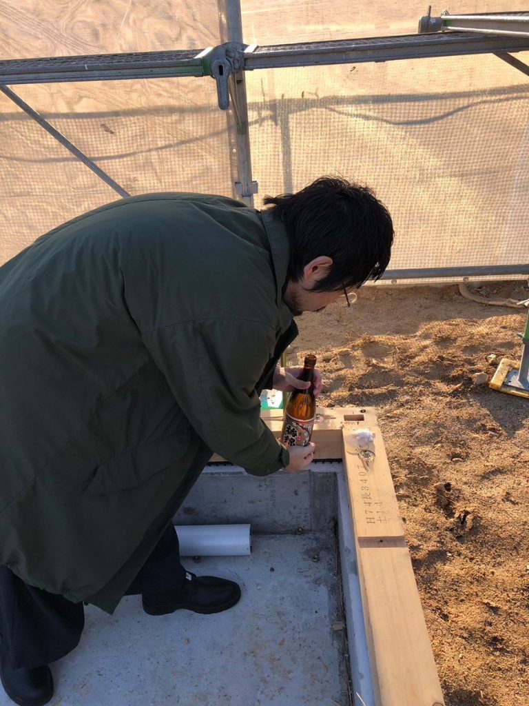 家の四隅の柱の部分に、酒や塩、お米などをまいてお清めをします。
