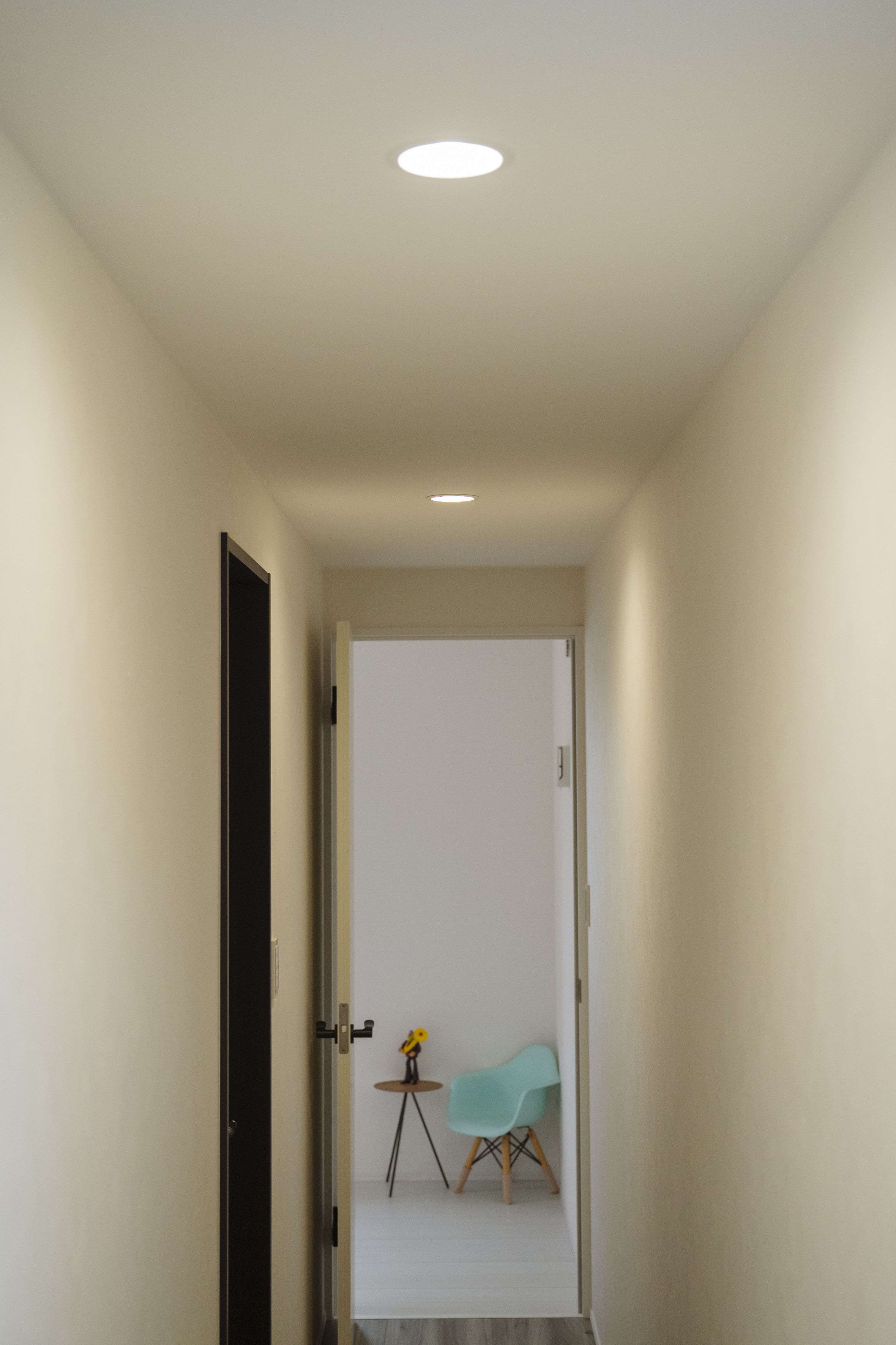 リビングや廊下は、天井に埋め込むダウンライトを中心にするとスッキリ見え、照明にホコリが溜まりにくく掃除もラクに。
