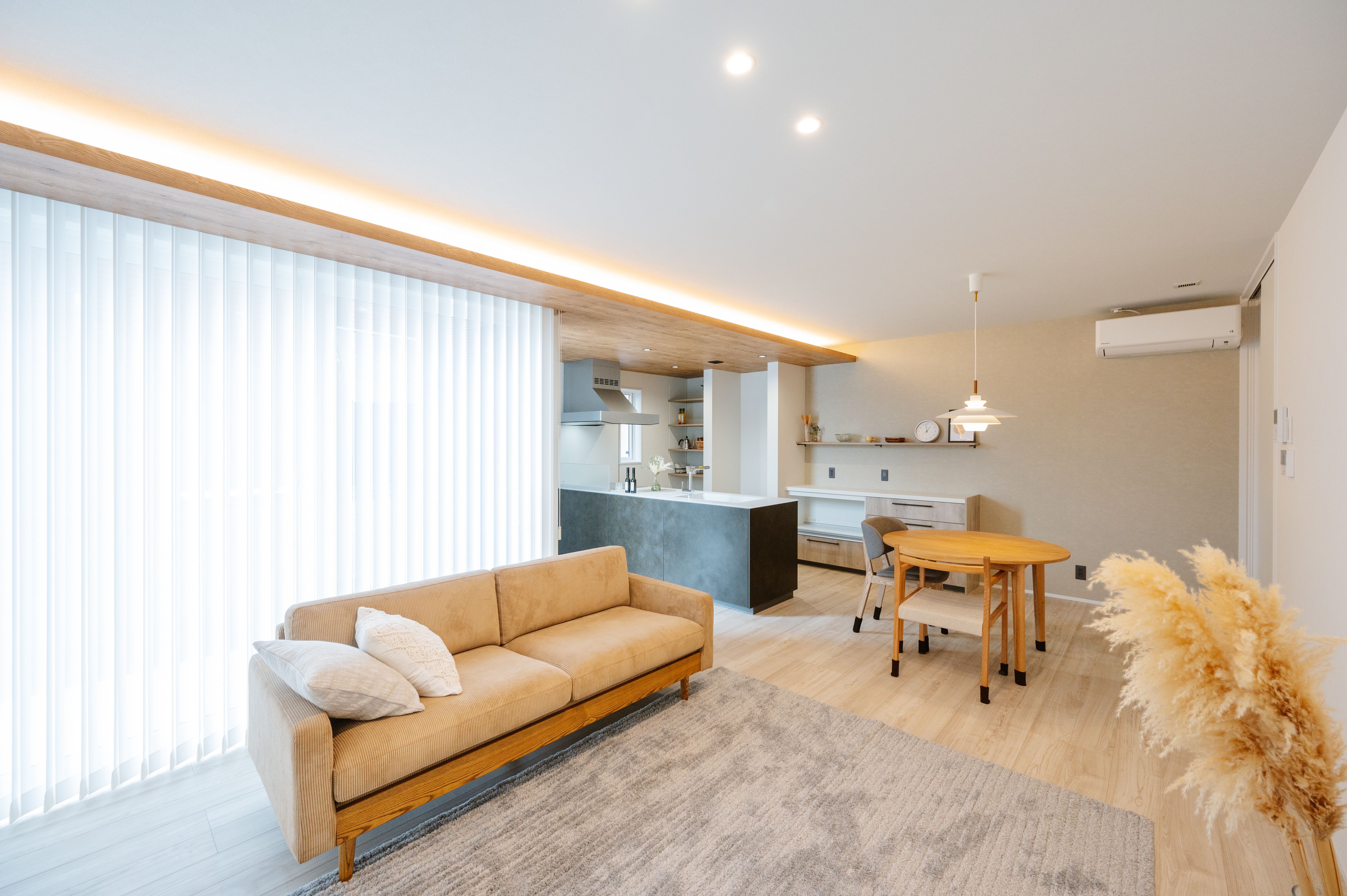 たとえば、リビングの天井や壁を柔らかく照らす間接照明を入れると、ホテルのような落ち着いた雰囲気に。