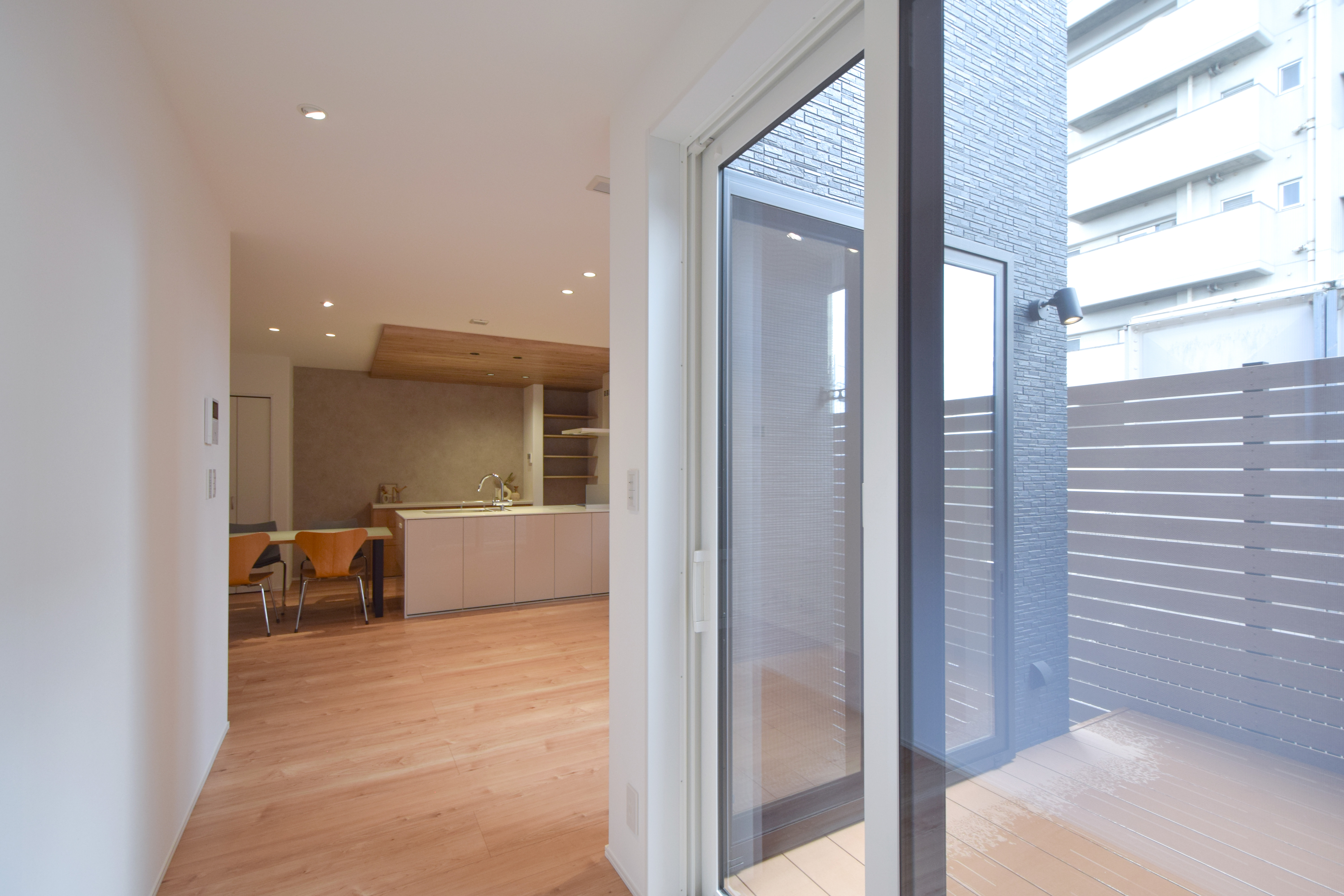 リビングにウッドデッキの中庭が隣接しています。外から見えないように背の高いフェンスを配置。
