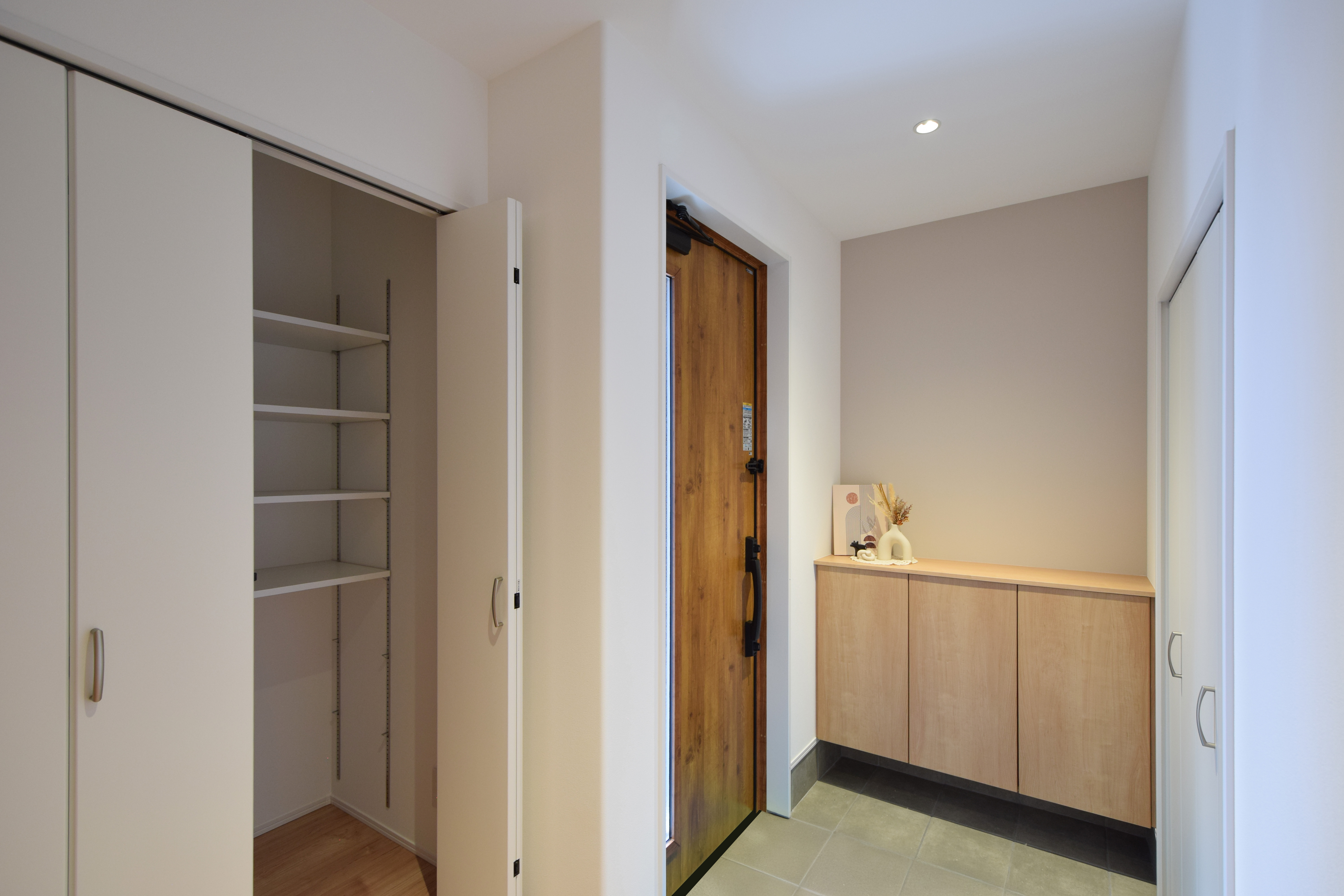 収納をたっぷり設けた玄関。シューズボックス+土間収納に、ホール収納。