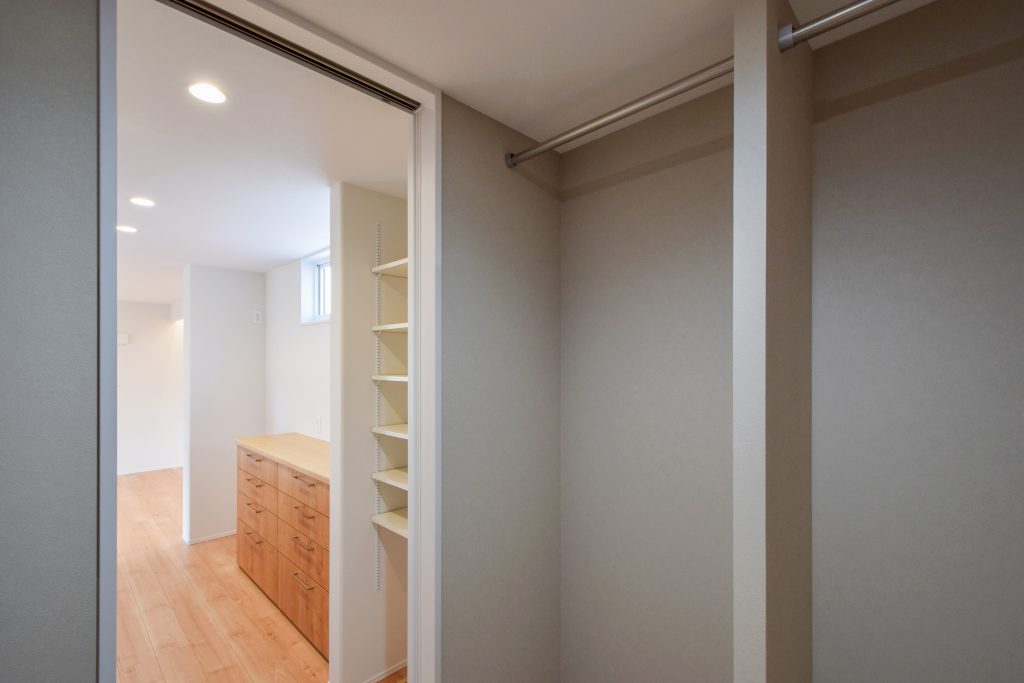 帰宅後の上着や荷物をしまいやすいように、玄関まわりに共有クローゼット・ファミリークローゼットを設けるのも人気の工夫です。