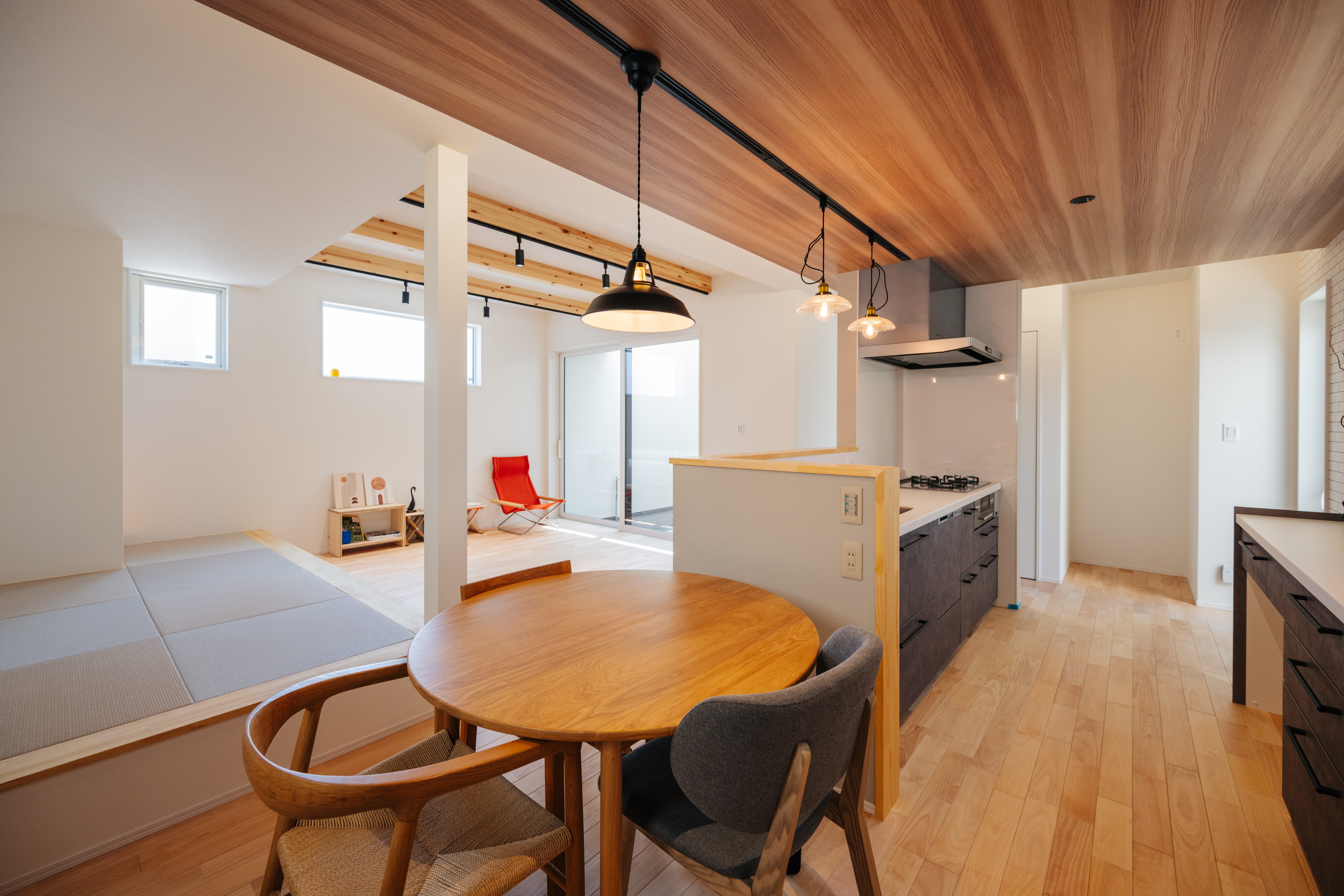 そのため、キッチンを中心に回遊できる動線をつくると、家族が自然に動きやすいLDKに。