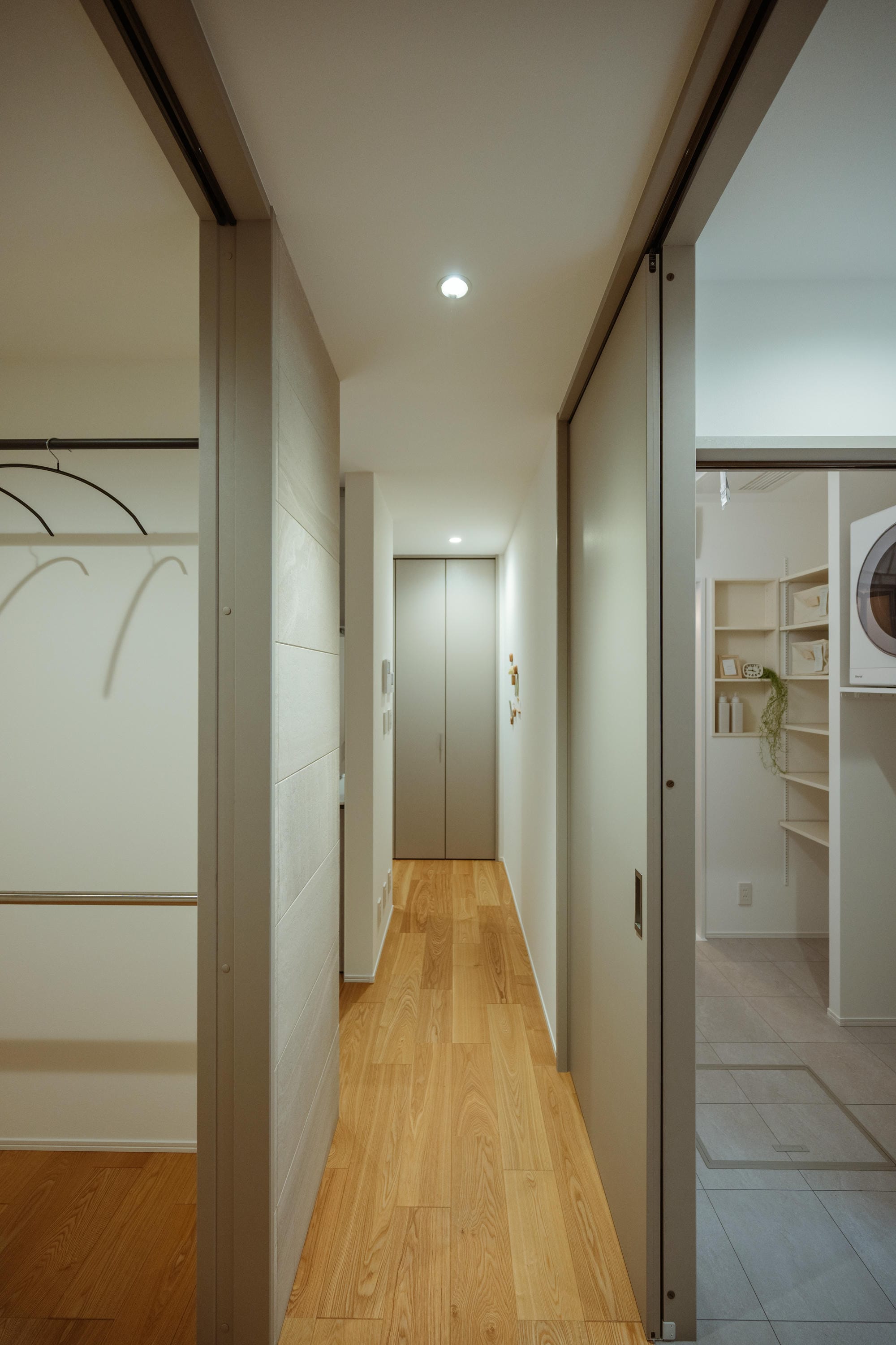 脱衣室には洗濯機と乾太くん(ガス乾燥機)をまとめ、すぐ向かいにファミリークローゼットを配置。廊下を挟んだ数歩の距離なので、洗う・乾かす。しまうの流れが一最短距離で完結します。