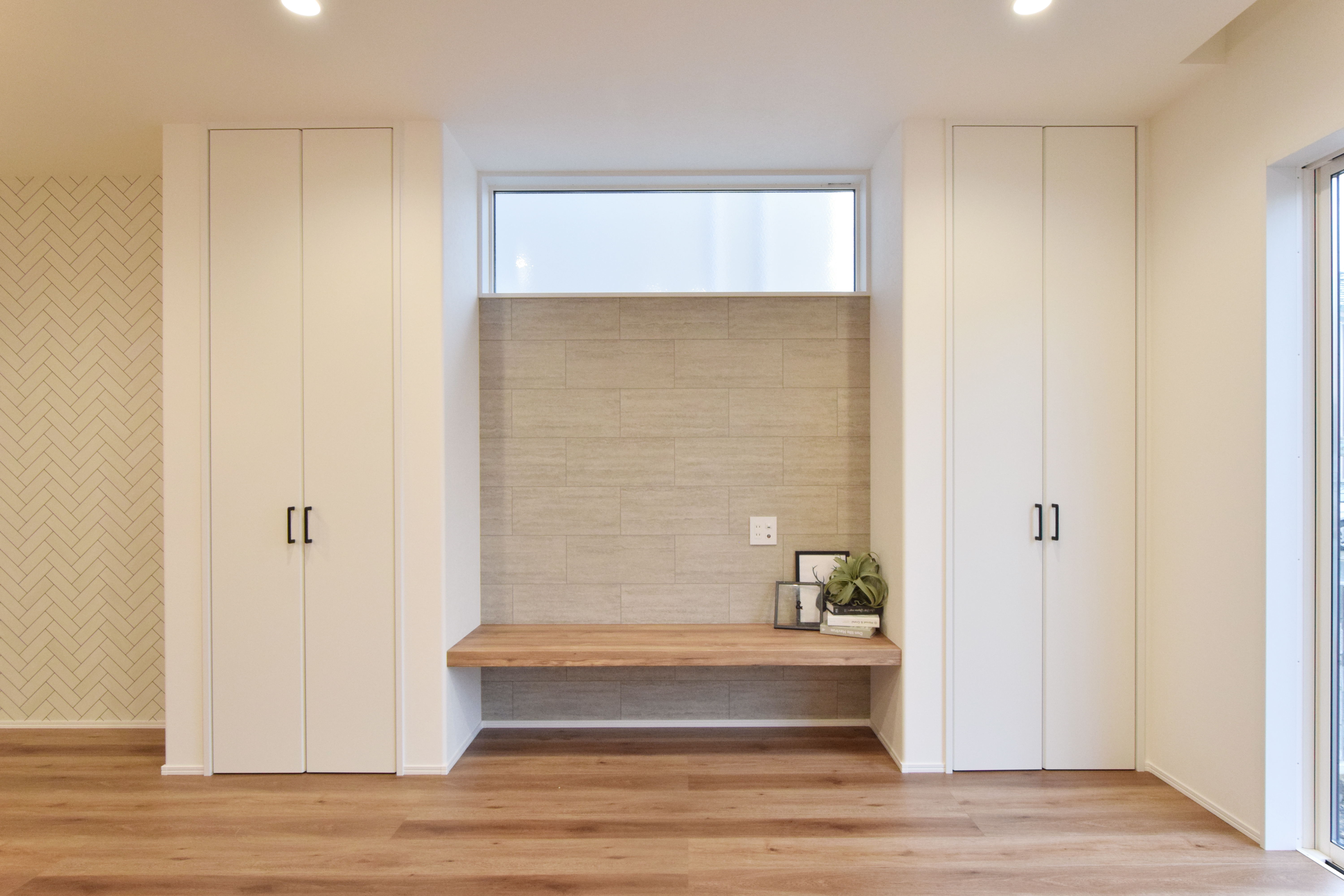 テレビボードの両側に収納を設けて、リビングに散らかりやすい「家族みんなが使うもの」をまとめてしまえるようにした間取り。テレビまわり機器やゲーム機、お子さまのおもちゃ、文房具などがリビングに集まりやすいものを、この専用置場をつくることで片付けの時間を短縮!