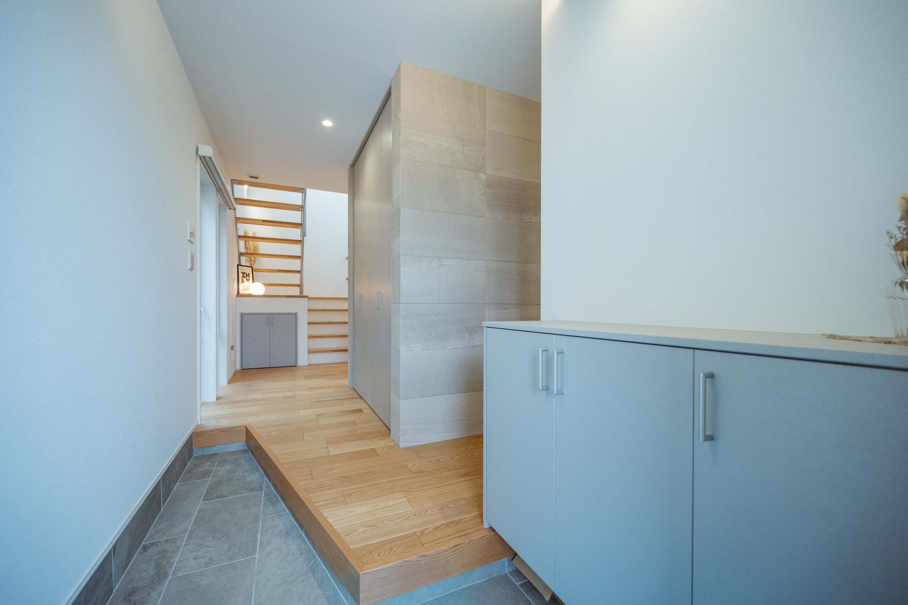 玄関から①リビングへつながる動線と、②土間収納・パントリー内を通りキッチンへ抜ける動線のある住まい。趣味の釣り道具を土間収納に収納、クーラーボックスなど重いものも楽々キッチンへ♪