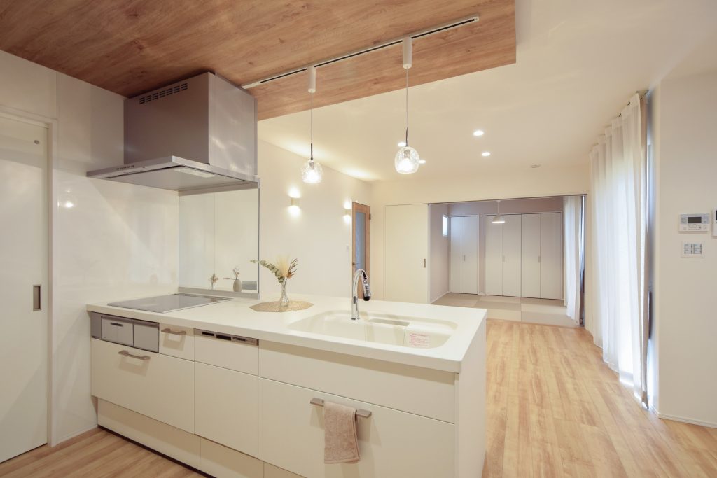 キッチン周りをぐるっと回遊できるようにすることで、食材買い物後の収納や調理中の行き来が短くなり、“立ち止まらずに動ける”家事ラク動線を実現した間取りです。