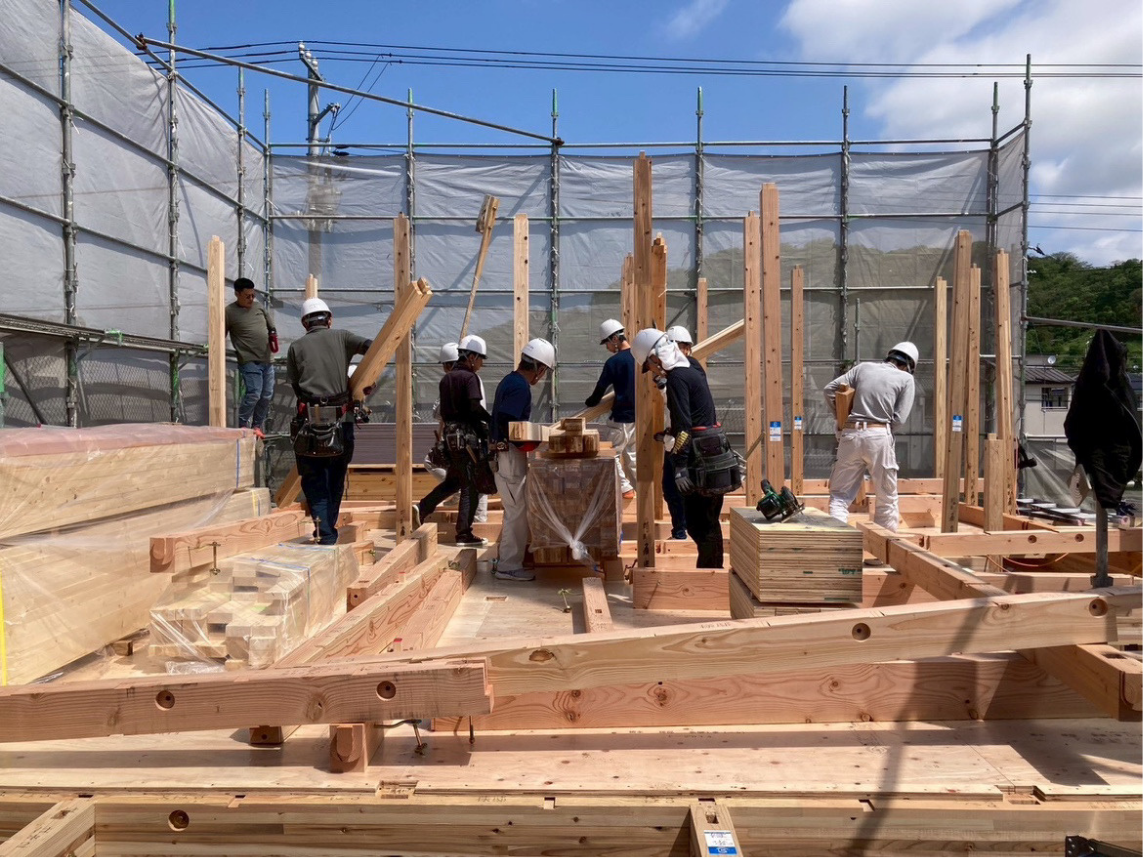 基礎工事が完了したら、柱・梁の構造材と屋根の下地までを一気に組み上げる上棟へ。建物の姿が立ち上がり、家づくりの実感がぐっと湧く瞬間です。