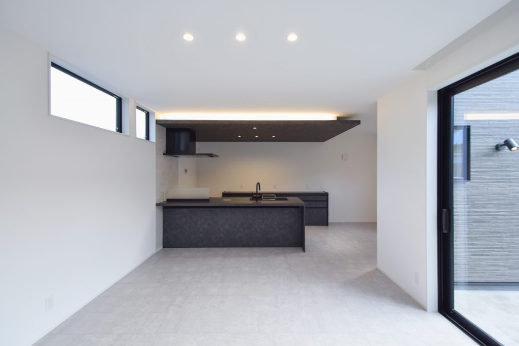 1階床は素材感のあるクレイ調のフローリングを採用。ダークトーンカラーで統一した建具やキッチンがアクセントに、ホテルライクな雰囲気に仕上がりました。