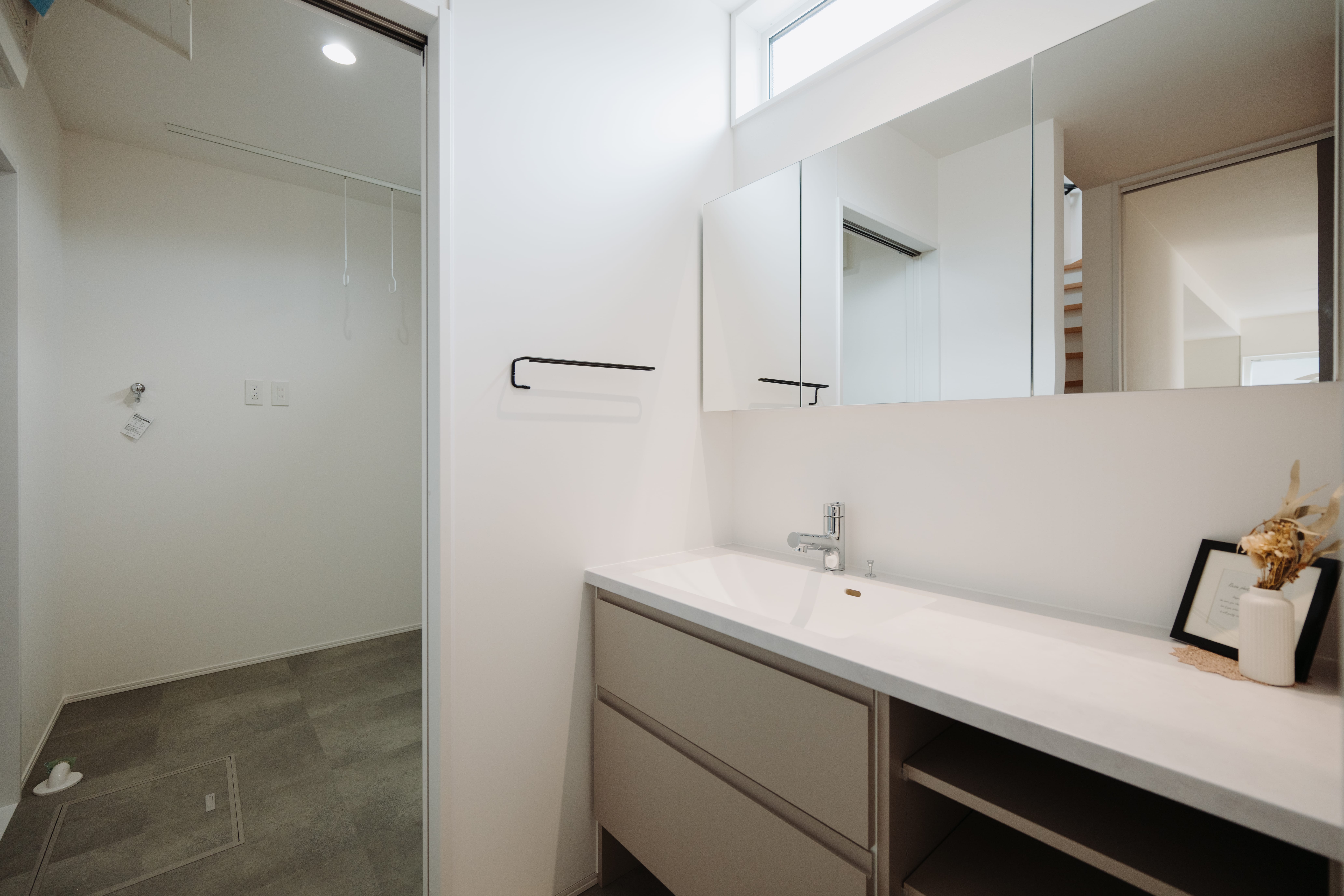 扉をなくした洗面は出入りしやすく、脱衣室とは分けて同時利用も快適。