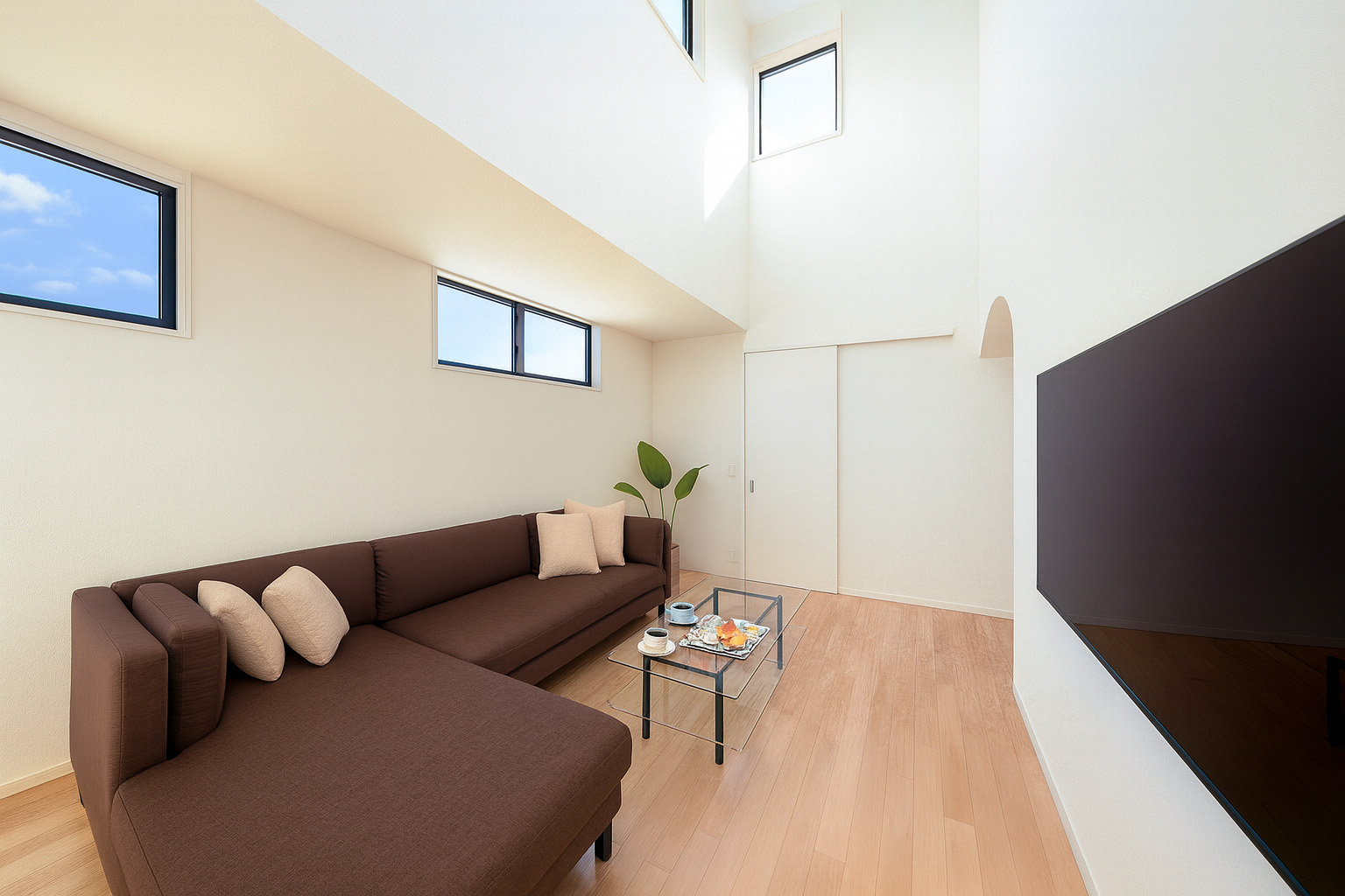 大きな吹き抜けが空間全体に光を届け、どこにいても明るく心地よいリビングに。
