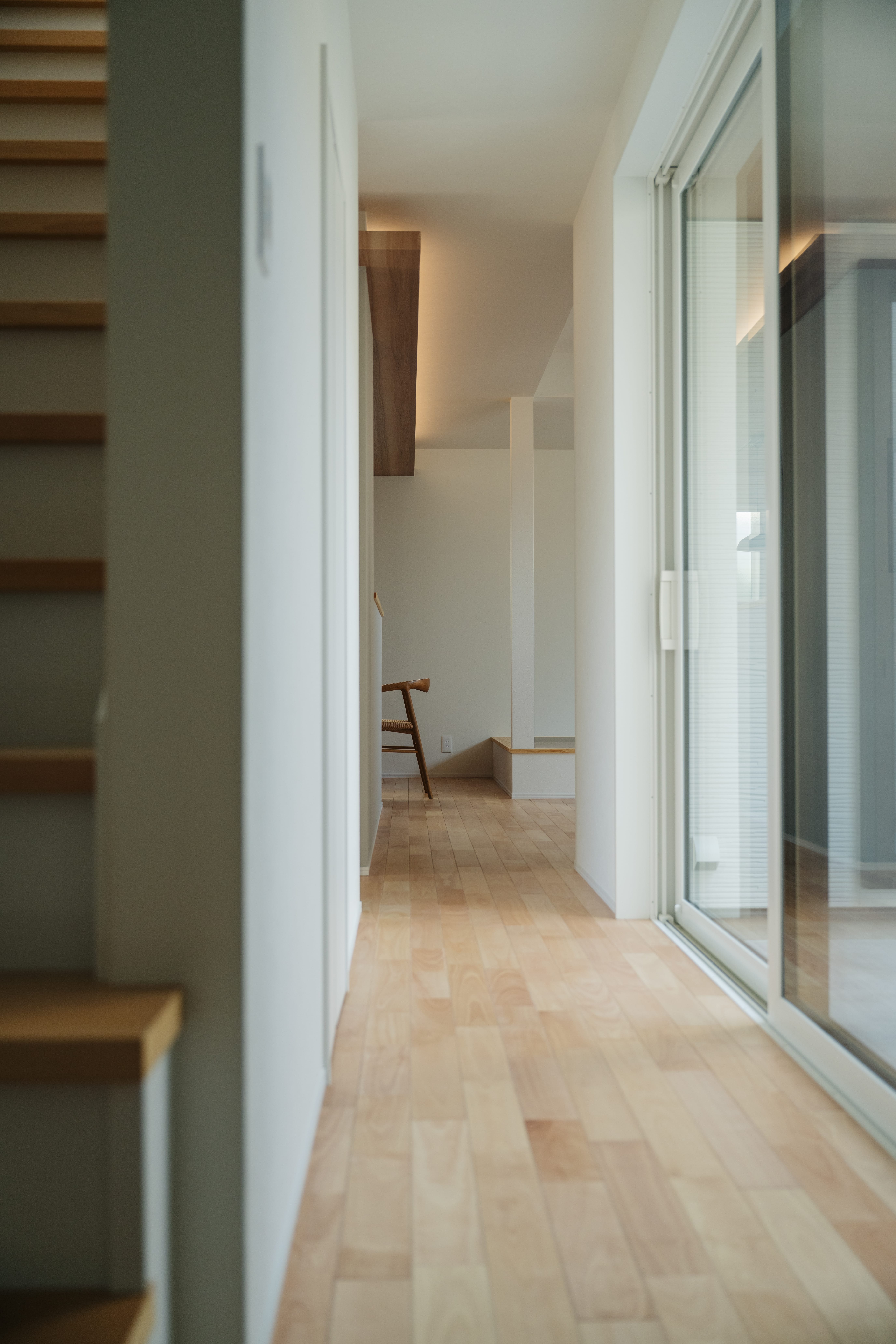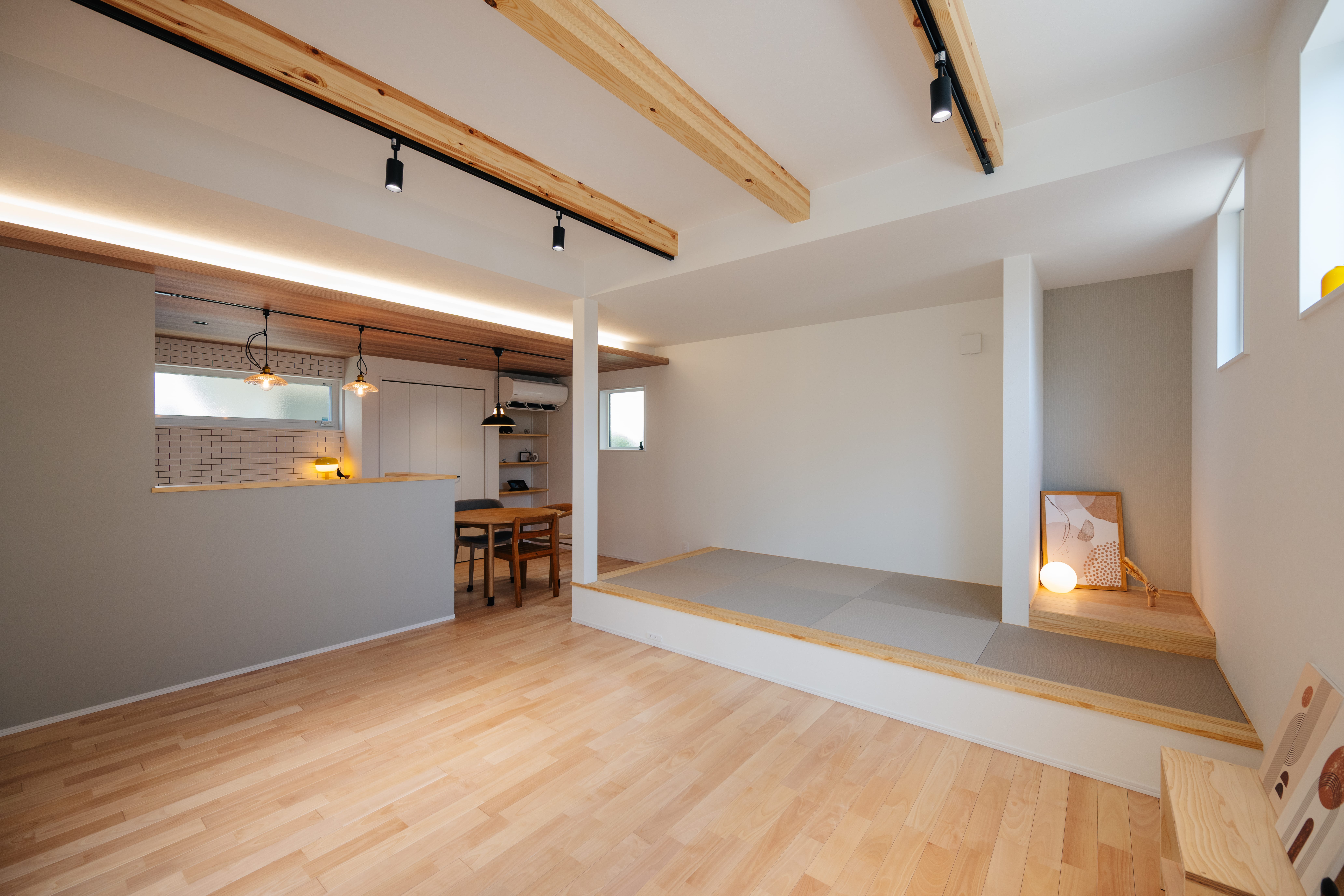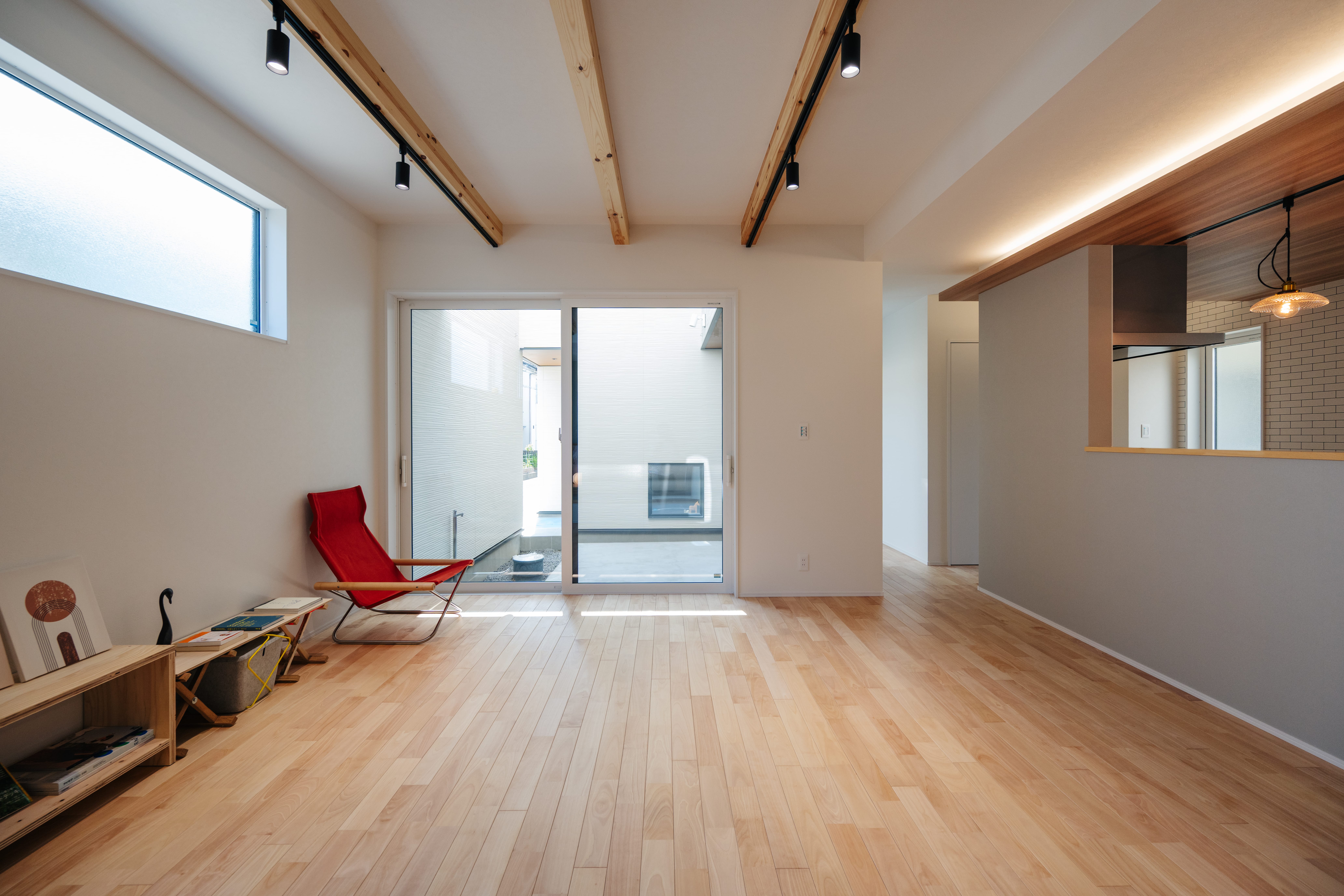 外からの視線を遮る中庭から光と風を取り込み、明るく開放的なLDKが広がります。見せ梁と下がり天井が生み出す立体感のある空間は、開放感と落ち着きの両方を楽しめる心地よい場所に。